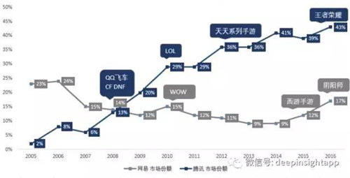 基于公司的財報和艾瑞的數(shù)據(jù),我們做出了兩家公司在游戲市場份額的變化趨勢,2008年是一個明顯的轉折點,這一年騰訊開始超越網(wǎng)易,2008-2010年三年的時間,騰訊通過LOL、DNF、QQ飛車、CF等爆款把游戲市場份額從6%提高到了接近30%。