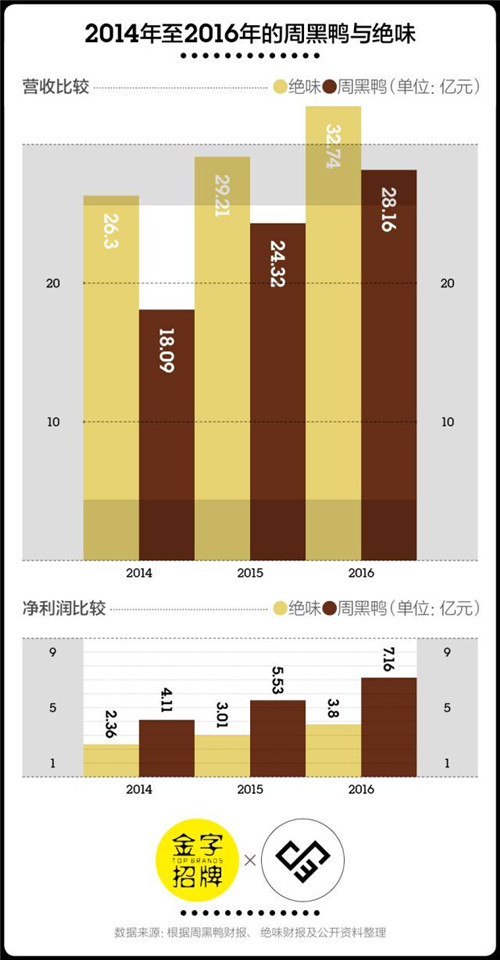 近兩年的市場(chǎng)表現(xiàn)沒有讓潘攀失望。根據(jù)咨詢公司弗諾斯特沙利文的數(shù)據(jù),中國(guó)休閑鹵制品零售總額從2010年的232億元增長(zhǎng)至2016年的637億元,年均復(fù)合增長(zhǎng)率為18.5%。截至2016年12月31日,周黑鴨全年?duì)I收約為28.16億元,較去年同期的24.32億元增長(zhǎng)15.8%。雖然778家的門店數(shù)量只有絕味的1/10左右,但周黑鴨的利潤(rùn)率是絕味的2倍多。