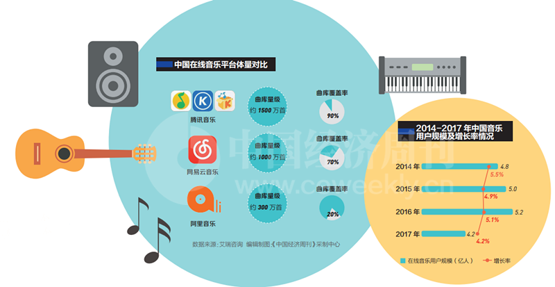 2016年7月,QQ音樂與酷我音樂、酷狗音樂并入騰訊音樂旗下后,騰訊開始對數(shù)字音樂版權(quán)著重布局。2017年3月和5月,騰訊音樂先后拿下中國大陸地區(qū)對環(huán)球音樂所擁有的音樂詞曲獨代權(quán)和數(shù)字版權(quán)分銷權(quán),并為此付出了3.5億美元現(xiàn)金及購買環(huán)球音樂1億美元期權(quán)的代價。“截至目前,全球范圍內(nèi)有200多家唱片公司持有數(shù)字音樂的版權(quán),目前90%以上都已經(jīng)被騰訊拿下。”一位網(wǎng)易云音樂內(nèi)部人士告訴《中國經(jīng)濟周刊》記者,騰訊音樂目前擁有的版權(quán)數(shù)量、廣度和對版權(quán)的投入都是業(yè)內(nèi)第一,其中不少是“獨家代理權(quán)”,相當于緊緊地扎起了一個籬笆。