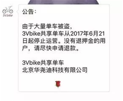 6月21日,共享單車平臺3Vbike對外宣布稱,由于單車大量被盜,即日起停止運(yùn)營。并提醒沒有退押金的用戶盡快申請退款。