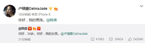 韓庚微博公布戀情,盧靖姍轉(zhuǎn)發(fā)回應(yīng)