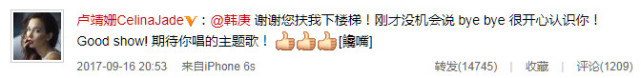 去年9月16日,第31屆金雞獎舉行頒獎典禮,盧靖姍曾與韓庚搭檔頒發(fā)最佳音樂獎,同臺互動。下樓梯時,韓庚細心地扶著盧靖姍,非常紳士。事后,盧靖姍還發(fā)微博專門感謝韓庚。