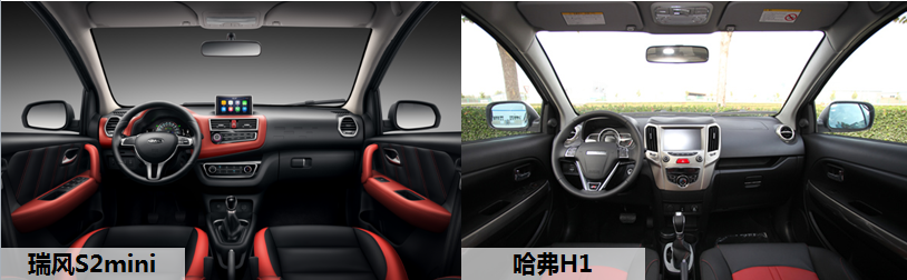 內(nèi)飾設計方面,瑞風S2mini采用紅黑配色,給人活潑時尚之感。且中控臺造型簡潔,懸浮式顯示屏的點綴更顯科技感。哈弗H1的內(nèi)飾設計雖同走簡潔風,但其中控臺銀色面板卻稍顯老氣,顯然與90后追逐新鮮感的個性不符。