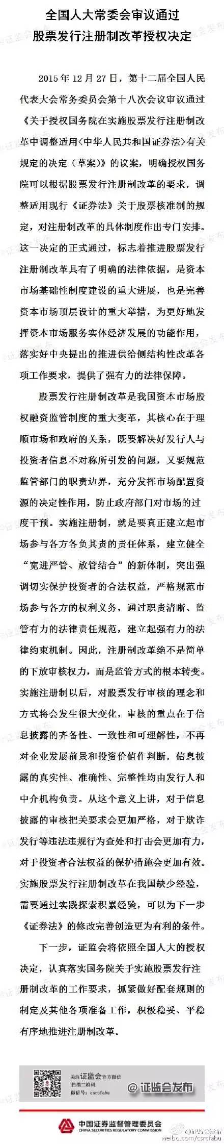 證監(jiān)會官方微博27日傍晚發(fā)布信息,稱全國人大常委會審議通過股票發(fā)行注冊制改革授權決定,下一步,證監(jiān)會將積極穩(wěn)妥、平穩(wěn)有序地推進注冊制改革。