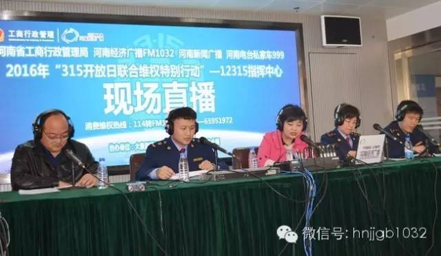 河南經(jīng)濟(jì)廣播在河南省工商局12315消費(fèi)者投訴舉報(bào)中心搭建直播室,河南經(jīng)濟(jì)廣播主持人依明和省工商局12315中心主任宋環(huán)英(右二)、省工商局12315消費(fèi)維權(quán)先鋒隊(duì)隊(duì)長(zhǎng)鄭巖(左二)、省工商局企業(yè)信用信息監(jiān)管處副處長(zhǎng)萬(wàn)柳(右一)、河南經(jīng)濟(jì)廣播特約評(píng)論員李剛(左一)在直播現(xiàn)場(chǎng)。