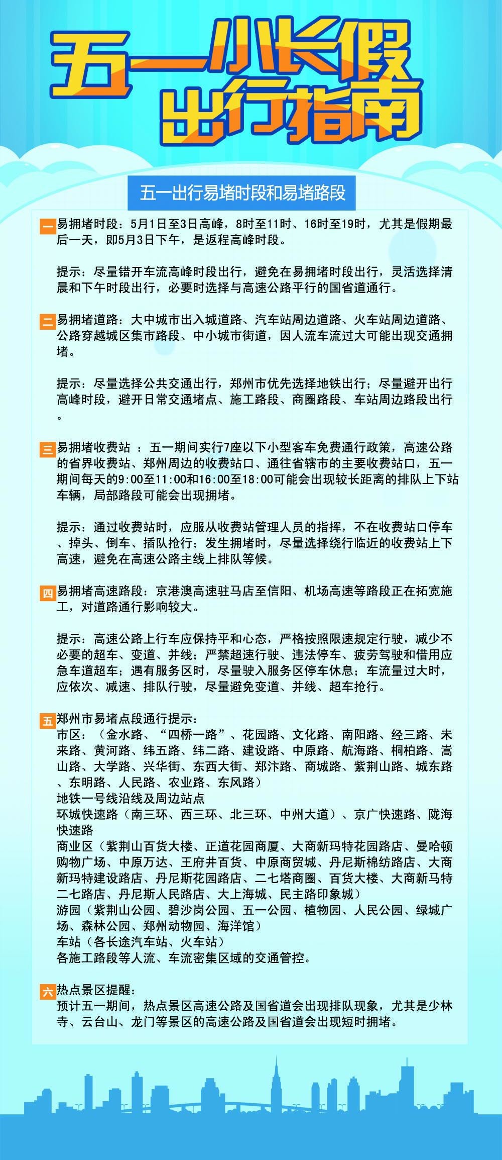 鄭州周邊20個(gè)收費(fèi)站中,受五一假期旅游出行影響,京港澳高速航海東路站、機(jī)場(chǎng)高速鄭州機(jī)場(chǎng)收費(fèi)站(中州第一門)、連霍高速柳林站文化路站及惠濟(jì)站、繞城高速侯寨站及十八里河站、鄭少高速西南站車流量非常大,易擁堵排隊(duì),可根據(jù)通行情況提前繞行新開通的連霍高速東三環(huán)北站、京港澳高速南三環(huán)站、繞城高速隴海西路站,也可繞行京港澳高速鄭東新區(qū)站、繞城高速豫龍站櫻桃溝站科學(xué)大道站和中原西路站。