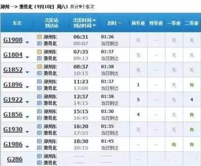 最快的一趟車G368/9,19點(diǎn)05分從上海虹橋始發(fā),23點(diǎn)02分到達(dá)鄭州東,耗時(shí)3小時(shí)57分,中途僅停靠南京和徐州站,其余列車運(yùn)行時(shí)間都在4小時(shí)到5小時(shí)之間。