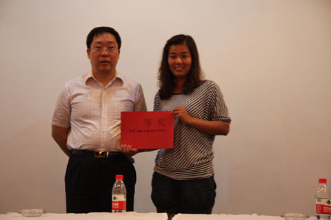 上圖為:河南人民廣播電臺(tái)辦公室主任崔根成(左)為獲得比賽一等獎(jiǎng)的選手武晶晶頒獎(jiǎng)