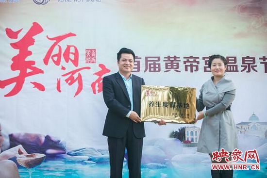 黃帝宮御溫泉被授予美麗河南“養(yǎng)生度假基地”稱號(hào),河南交通廣播總監(jiān)助理李芮女士和銀基國際旅游度假區(qū)總經(jīng)理譚忠山先生進(jìn)行了授牌儀式,光可鑒人的水晶皇后見證了這歷史的一刻。