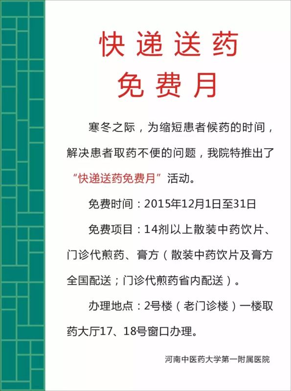河南中醫(yī)學(xué)院第一附屬醫(yī)院藥學(xué)部—— 讓患者吃上道地好中藥即日起,該院推出“快遞送藥免費(fèi)月”惠民活動。