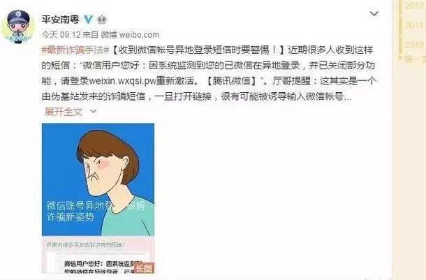 #最新詐騙手法#【收到微信帳號(hào)異地登錄短信時(shí)要警惕!】近期很多人收到這樣的短信:“微信用戶您好:因系統(tǒng)監(jiān)測(cè)到您的已微信在異地登錄,并已關(guān)閉部分功能,請(qǐng)登錄weixin.wxqsi.pw重新激活?!掘v訊微信】”。廳哥提醒:這其實(shí)是一個(gè)由偽基站發(fā)來(lái)的詐騙短信,一旦打開鏈接,很有可能被誘導(dǎo)輸入微信帳號(hào)、微信密碼、支付密碼、驗(yàn)證碼等,后果不堪設(shè)想……