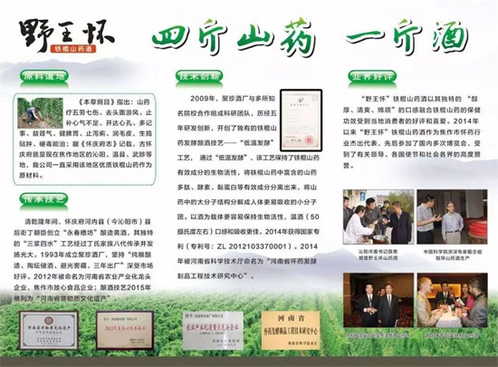 通過多方溝通尋訪,于2009年開始與多家大專院校合作共同研發(fā)鐵棍山藥酒,研發(fā)過程也是歷經(jīng)了不少的艱辛坎坷,歷時5年,終于成功。于2014年獲得了國家專利,并于2014年成立了野王懷氏生物科技有限公司,鐵棍山藥酒通過低溫發(fā)酵釀造成酒,不僅能將山藥中的營養(yǎng)成份悉數(shù)保留,藥借酒力,酒攜藥功,更是使人體吸收率大幅提高,賦予了懷鐵棍山藥更高的價值。同時,與當?shù)厣剿幏N植戶和合作社簽訂常年收購合同,穩(wěn)定了山藥的市場價格,也帶領(lǐng)著大家一起致富奔小康。