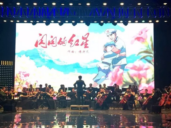 伴隨臺上指揮黃俊博的手勢起,河南愛樂樂團開始演奏交響樂《紅旗頌》。