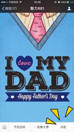 本周日就是父親節(jié)了。平時(shí)向爸爸們表達(dá)情意的機(jī)會(huì)可能不多,趁著節(jié)日,你可別落下。特意給親愛的老爸準(zhǔn)備了一份禮物,6月14日——6月16日,點(diǎn)擊菜單欄中的“點(diǎn)歌”或直接點(diǎn)擊本文底部的閱讀原文,進(jìn)入點(diǎn)歌互動(dòng)頁(yè)后點(diǎn)擊“立即點(diǎn)歌”,填寫并提交姓名、手機(jī)號(hào)、所點(diǎn)歌曲名稱、以及你想對(duì)父親說(shuō)的話。