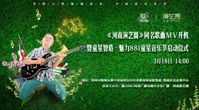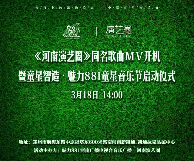 童星智造·魅力881童星音樂(lè)節(jié)啟動(dòng)儀式暨《河南演藝圈》同名歌曲mv開(kāi)機(jī)將于3月18日下午2點(diǎn)河南新凱迪·凱迪拉克品鑒中心舉行,本次活動(dòng)由魅力881河南廣播電視臺(tái)音樂(lè)廣播和河南演藝圈主辦,讓我們一起為本土童星音樂(lè)藝術(shù)加油打CALL !??!