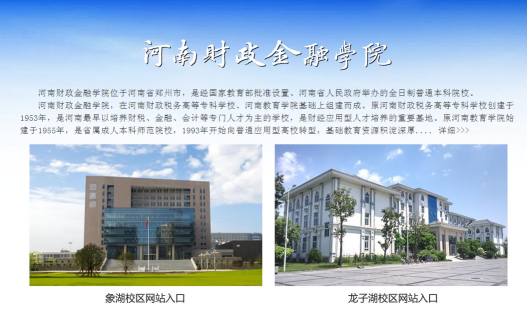 目前,河南財(cái)政金融學(xué)院共有兩個(gè)校區(qū),分別座落在鄭東新區(qū)的象湖、龍子湖畔,在校生近兩萬(wàn)人,占地面積100.6萬(wàn)平方米(1509畝),建筑面積58.69萬(wàn)平方米。
