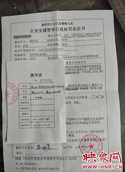 11月2日下午16時(shí)許,偃師市交警大隊(duì)給韓先生開(kāi)具了公安交通管理行政處罰決定書(shū)【2017】410321-2900412916號(hào),處罰900元。韓先生急匆匆去交了900元罰款后,拿了交警隊(duì)的交款單去了交通局,交通局于當(dāng)天晚上17時(shí)30分許,給韓開(kāi)具放車(chē)單。韓去停車(chē)場(chǎng)看到自己的車(chē)時(shí),已經(jīng)是當(dāng)天晚上20時(shí)以后了。