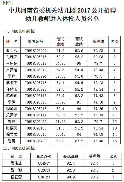 中共河南省委機(jī)關(guān)幼兒園2017年公開招聘幼兒教師面試工作已經(jīng)結(jié)束。根據(jù)總成績排名,按照招聘人數(shù)與體檢人數(shù)1:1的比例,確定480201崗位15名考生進(jìn)入體檢環(huán)節(jié),480202崗位3名考生進(jìn)入體檢環(huán)節(jié)。