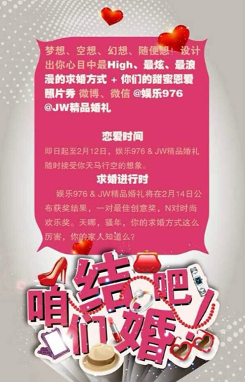 2月12日娛樂976全新上線,我們?yōu)槟蛟煲粓鰪V播史上最時尚最浪漫的求婚派對+結(jié)婚盛典!只要心中有愛,求婚方式可以多姿多彩,怎樣的求婚才能讓她難忘、心甘情愿說“I do!”?現(xiàn)在,只要有創(chuàng)意的求婚方式,就可以獲得10萬元求婚+結(jié)婚盛典!求婚,你準(zhǔn)備好了嗎?咱們結(jié)婚吧!