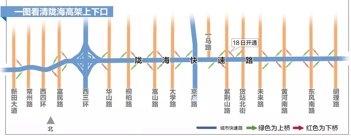 在本月6日,隴海路紫荊山路南側(cè)由西向東上橋匝道、隴海路錢塘路北側(cè)由東向西下橋匝道也已開通。