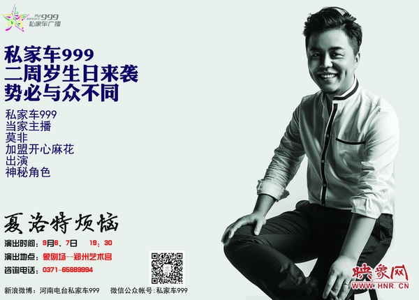 活動(dòng)內(nèi)容:正值私家車999兩歲生日來臨之際,私家車999特邀開心麻花全國票房口碑雙料冠軍《夏洛特?zé)馈吩卩嵵菹髣鲩_演,私家車999主持人將擔(dān)綱劇中角色,9月6日、9月7日象劇場鄭州藝術(shù)宮,一起來過生日吧!