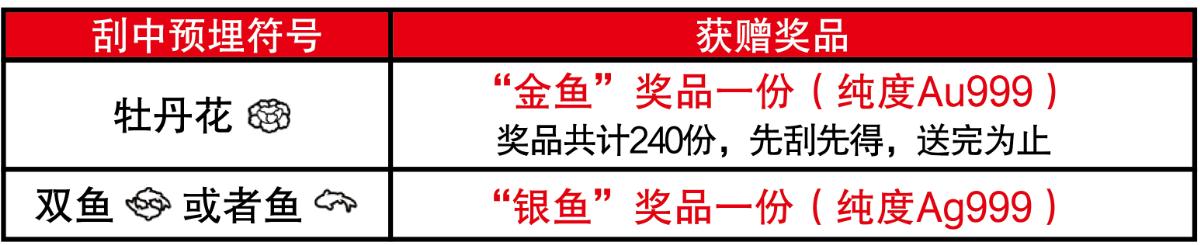 活動期間,彩民在我省任一體彩銷售網(wǎng)點(diǎn)購買30元面值“富貴有余”主題即開票,若單張彩票刮出符合獎勵條件的預(yù)埋符號,并經(jīng)兌獎設(shè)備(IVT或BCR等)完成掃描確認(rèn)(促銷兌獎)且剪角處理后,即可獲贈精美獎品一份,詳見下表: