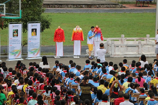 在建設美麗鄉(xiāng)村的社會背景下,“冠軍課堂”鄉(xiāng)村行是廣東省體彩中心、廣東省青少年體育聯(lián)合會對“公益體彩·快樂操場”活動的延伸,由國家級跳水教練、奧運冠軍教練胡恩勇帶領世界冠軍及優(yōu)秀運動員,歷時4個月,走進9地市的25 所山區(qū)中小學校,為那里的師生帶去體育器材,上一堂公益體育課,部分優(yōu)秀運動員還會在受助學校支教半年?;顒訛楹⒆觽儤淞⒘恕皭圻\動,強體魄”的觀念,讓缺少體育器材和專業(yè)體育教師的孩子們都能“每天快樂運動一小時”。