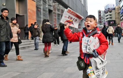 元旦小長假第二天,寒風(fēng)凜冽,氣溫降到-5℃。南京新街口地鐵口川流不息的人流中,一個身穿紅色外套,背著青奧吉祥物“砳砳”的小男孩格外引人注目。他背著一只碩大口袋,報袋上印有“賣一份報紙捐一毛錢”字樣,一邊走一邊叫,“賣報,賣報——”他就是去年大年夜一祼成名的裸跑弟多多,這是他的鷹爸在對他進(jìn)行財商訓(xùn)練。據(jù)悉,這是鷹式教育“十商并舉”中的重要一環(huán)。
