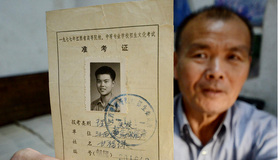 1978年夏天,迎來(lái)恢復(fù)高考后的第二次考試,考試結(jié)束后,甘福保跑到高招辦買了試卷回來(lái)自己做,從此后,他就一發(fā)不可收拾,每年高考都會(huì)買一份試卷回來(lái),一直堅(jiān)持到2016年的高考。圖為甘福保展示當(dāng)年高考時(shí)的準(zhǔn)考證。