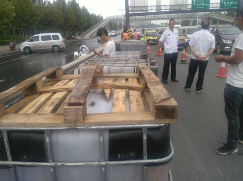 據(jù)貨車(chē)司機(jī)介紹,他車(chē)上拉的這些邊長(zhǎng)約1米的方形大桶是裝醬油用的,當(dāng)天拉著這些空桶從新鄭來(lái)到鄭州,因?qū)β窙r不熟,不知道此處上橋口有3米的限高桿,直到上橋時(shí)撞上限高桿后,才知道貨車(chē)不讓上三環(huán)立交橋。