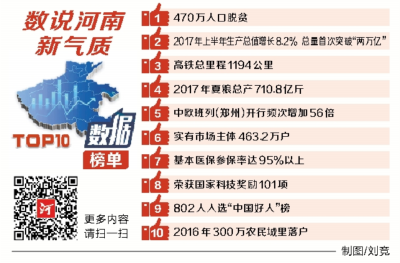 120多萬張選票,110多萬人次閱讀量!經(jīng)過網(wǎng)絡(luò)票選和專家評審,9月18日,河南日報喜迎十九大特別策劃——“砥礪奮進的五年·數(shù)說河南新氣質(zhì)”TOP10數(shù)據(jù)正式出爐。這是一份飽含著自豪感的榜單。這組數(shù)據(jù)不僅濃縮了河南五年的成就,也凝聚著無數(shù)人對家鄉(xiāng)的熱愛和驕傲。