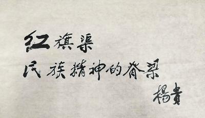 采訪結束時,楊老不顧身體勞累,為“大河報紀念紅旗渠通水50周年特刊”題寫刊名:“紅旗渠民族精神的脊梁”。
