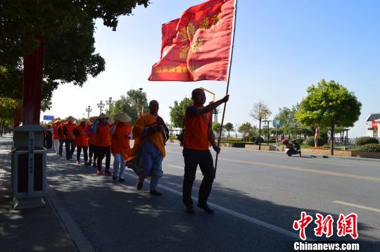 圖為朝圣團一行30人在少林寺延偵法師、延宗法師的帶領下,徒步行腳。 少林寺供圖 攝圖為朝圣團一行30人在少林寺延偵法師、延宗法師的帶領下,徒步行腳。 少林寺供圖 攝