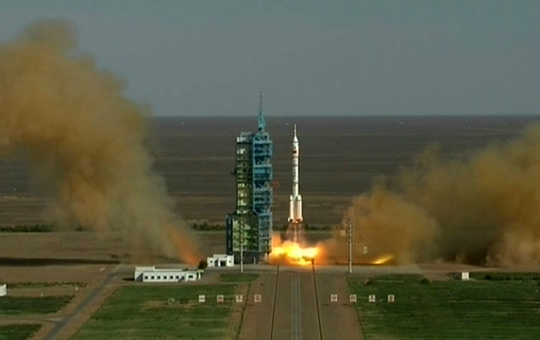 6月11日17時(shí)38分許,長(zhǎng)征二號(hào)F遙十運(yùn)載火箭在酒泉衛(wèi)星發(fā)射中心中國(guó)載人航天發(fā)射場(chǎng)順利點(diǎn)火起飛,將神舟十號(hào)載人飛船發(fā)射升空。電視截圖