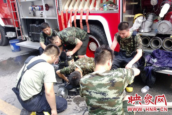 由于天氣炎熱,加上接近火災(zāi)現(xiàn)場(chǎng)、救援時(shí)間長(zhǎng),多名消防戰(zhàn)士虛脫暈倒,現(xiàn)場(chǎng)注射和飲用生理鹽水,附近商戶也為消防戰(zhàn)士送來(lái)飲用水。
