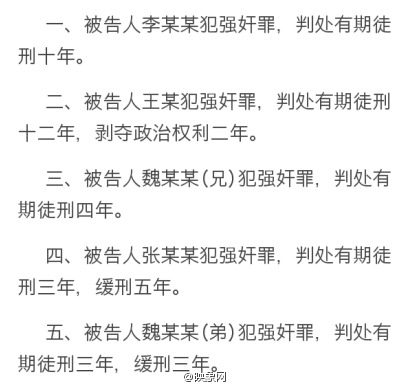 映象網(wǎng)訊 9月26日上午,北京法院網(wǎng)官方微博@京法網(wǎng)事 消息:李某某等5人強(qiáng)奸案一審宣判,其中,被告人李某某犯強(qiáng)奸罪,被判處有期徒刑10年。
