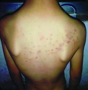 10月8日,謝女士在給小韋洗澡時(shí),發(fā)現(xiàn)孩子的后背上都是紅斑,像是被什么硬東西戳傷的。從謝女士提供的照片可以看到,小韋的后背上是成片的紅斑,記者粗略地?cái)?shù)了一下,紅斑超過(guò)50個(gè)?!爱?dāng)時(shí)我問(wèn)他是怎么搞的,孩子也不說(shuō),我以為是在學(xué)校玩摔倒弄的,就沒再追問(wèn)?!?/p>
