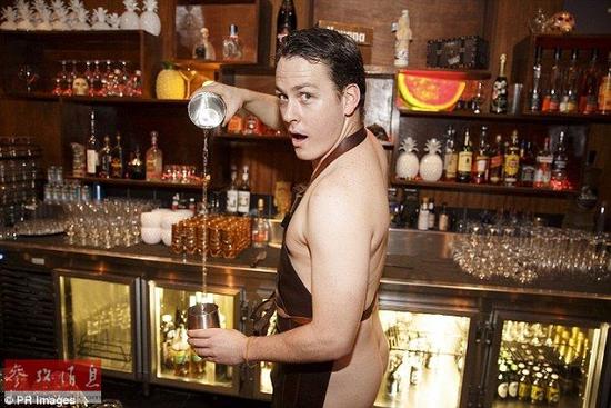 餐廳里的服務員們都只穿著裸色的內(nèi)褲,并在腰上圍著樹葉??瓷先ズ苡泄畔ED風格。