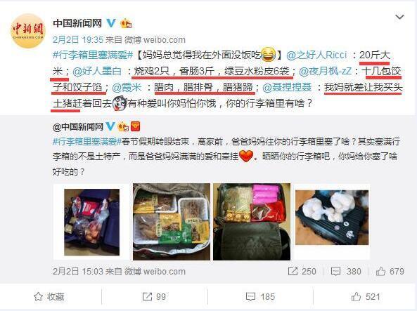 年,就這么過完了……@中國新聞網(wǎng)在微博上發(fā)起了一個過年返程催淚話題#行李箱里塞滿愛#,離家前,爸爸媽媽往你行李箱里都塞了啥?看了網(wǎng)友的回復(fù),有饅頭、大米、土雞蛋、餃子餡、燒雞……簡直笑到飆淚。其實(shí),塞滿行李箱的不是土特產(chǎn)、不是洋氣貨,是愛、是滿滿的牽掛與不舍!