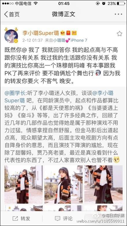 這條微博讓李小璐怒了。李小璐隨后轉(zhuǎn)發(fā)并寫道:“既然你@ 我了,我就回答你,我的起點(diǎn)高與不高跟你沒有關(guān)系,我過我的生活跟你沒有關(guān)系,我的演技比你高出一個(gè)珠穆朗瑪峰,有本事跟我PK了再來評價(jià),要不咱倆尬個(gè)舞也行,因?yàn)槲业霓D(zhuǎn)發(fā)你要火,不客氣,晚安?!?/p>