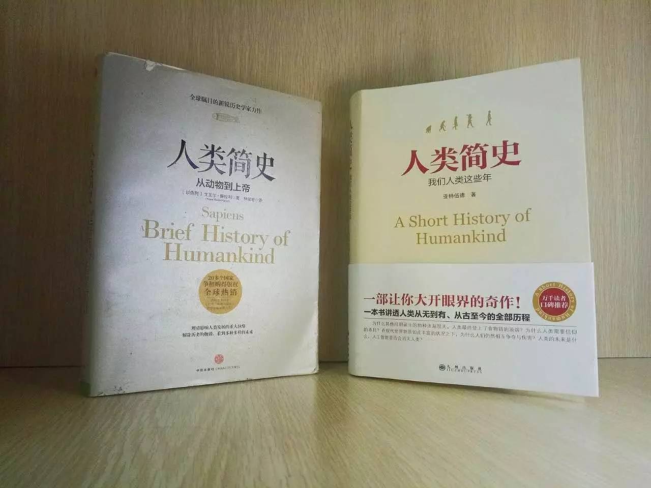以色列作家尤瓦爾·赫拉利的《人類簡史——從動物到上帝》(左)和九州出版社2016年5月出版的《人類簡史——我們?nèi)祟愡@些年》(右)。新京報記者高敏 攝