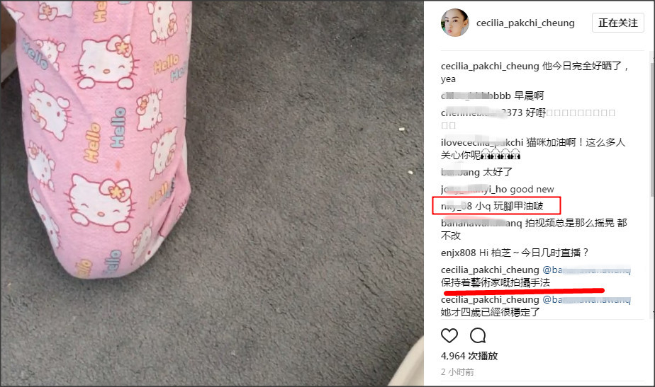 最后喂完貓后張柏芝拿起手機(jī)拍攝,這時(shí)候貓?zhí)搅诵的腳上。在鏡頭里面我們意外發(fā)現(xiàn)小Q的腳趾甲全部都涂了腳指甲油,而且顏色還是非常亮眼的粉紅色,看來(lái)小Q內(nèi)心保持著一顆少女心啦。