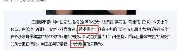 此外,另一篇來自三湘都市報,題為《張柏芝當評委現(xiàn)身長沙至潮五星辣媽揭曉》的報道也提到,在長沙市婦聯(lián)、市女企業(yè)家協(xié)會、香港貴之步聯(lián)合主辦的“長沙市首屆時尚潮媽評選活動”中,楊樂樂亦出席。