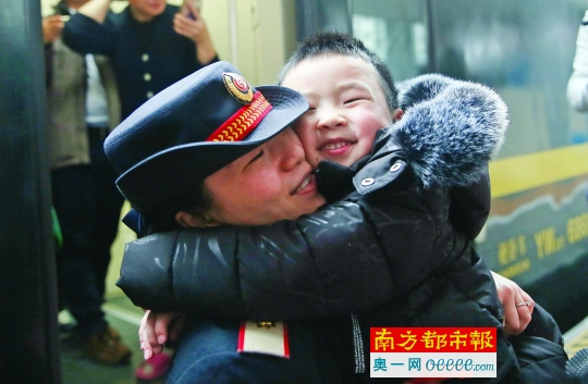 2月10日16時(shí)57分,深圳開往烏魯木齊的Z 230次列車??亢怅?yáng)站,由知名導(dǎo)演陳可辛執(zhí)導(dǎo)的短片《三分鐘》原型列車員劉鐘與兒子丁丁在站臺(tái)短暫相聚三分鐘。緊緊的相擁后告別在即,劉鐘眼中含淚,她還要上班至15日。不過,讓劉鐘特別開心的是今年她終于可以回家過除夕,這是11年來第一次。 南都記者 馬強(qiáng) 攝