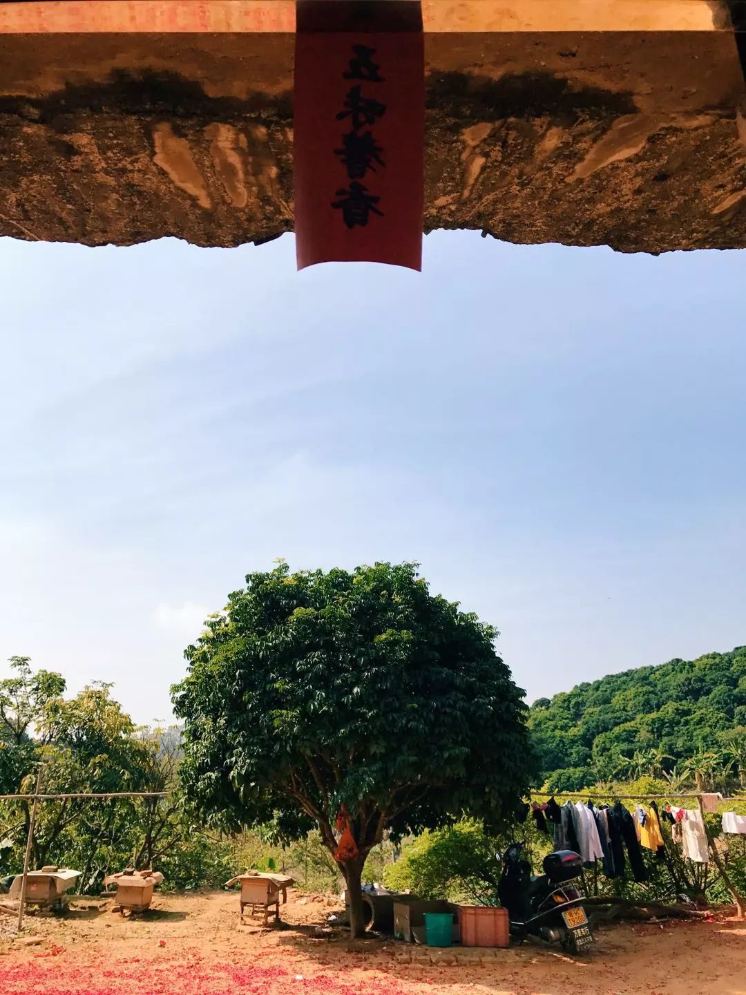 初一那天在爐灶燒柴時(shí),抬頭看到了二伯種的黃皮樹,三伯養(yǎng)的蜜蜂,一旁晾曬的衣服,出行的摩托,還有散落滿地的鞭炮殘?jiān)瓕?duì)了,還有屋頂貼的“五味馨香”,突然覺得,這一片家園就是心中最好的世外桃源。
