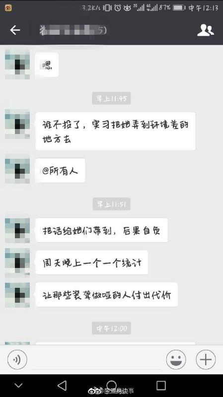 該網(wǎng)友提供的聊天截圖顯示,一個(gè)昵稱叫“大江東去”的人4月21日在班級(jí)微信群中說(shuō)“明天繼續(xù)投,咱班每個(gè)同學(xué)都要投”“沒(méi)投的同學(xué)趕快投下”“現(xiàn)在才投了一百多個(gè)人”。在另一個(gè)名叫“首腦交流群”的微信群中,“大江東去”對(duì)班干部說(shuō):“誰(shuí)不投了,實(shí)習(xí)把她弄到環(huán)境差的地方去”“把話給她們帶到,后果自負(fù)”“周天晚上一個(gè)一個(gè)統(tǒng)計(jì)”“讓那些裝聾作啞的人付出代價(jià)”。