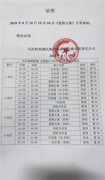 內(nèi)蒙古網(wǎng)友Zinc_Zn_Zn在微博上曬出包百嘉峻影城偷票房,她買的《一出好戲》的票,結(jié)果票根卻是《愛(ài)情公寓》。該影城提供了當(dāng)天所有影片排場(chǎng)證明,《愛(ài)情公寓》為19:10的場(chǎng)次,同一時(shí)間沒(méi)有《一出好戲》的場(chǎng)次,網(wǎng)友微博所發(fā)情況不屬實(shí)。