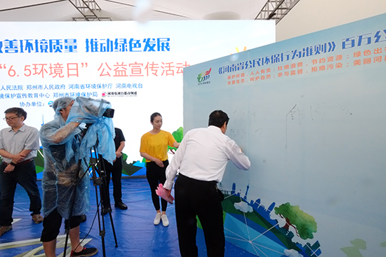 十一位領(lǐng)導(dǎo)共同啟動了“《河南省公民環(huán)保行為準(zhǔn)則》百萬公民電子簽名墻”正式上線儀式,并在《河南省公民環(huán)保行為準(zhǔn)則》百萬公民簽名墻上,簽下自己的名字,成為首批在“百萬公民簽名墻”上簽字的環(huán)保志愿者!