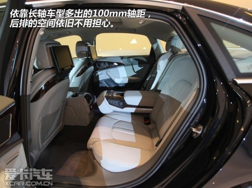 轉(zhuǎn)至后排,這里應(yīng)該同樣是車主們最為關(guān)注的,依靠長軸車型多出的100mm軸距,后排的空間依舊不用擔(dān)心。而影音娛樂系統(tǒng)也同樣沒有被忽視,在座椅中間的操作面板中 ,除了沒有MMI touch手寫板外,其它功能與前排幾乎相同。