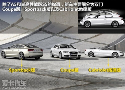 車(chē)型方面,2012款車(chē)型除了A5和其高性能版S5的稱謂,新車(chē)主要細(xì)分為雙門(mén)Coupe版、Sportback版以及Cabriolet敞篷版。據(jù)悉,此次國(guó)內(nèi)曝光的測(cè)試車(chē)輛是雙門(mén)Coupe版。